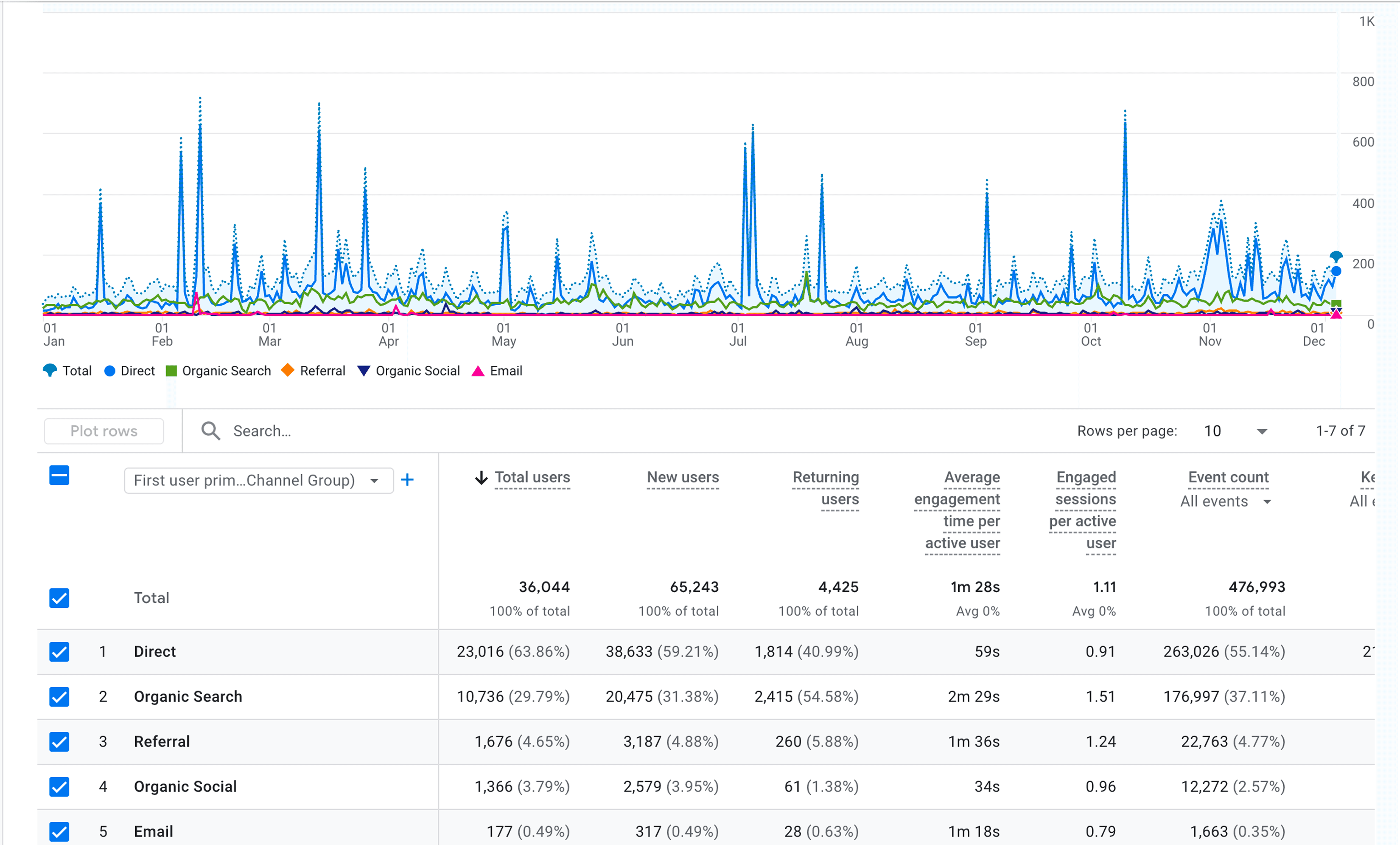 Organic traffic comes in as the 2nd most popular channel after direct. This points at a number of issues, because it means users who arrive are probably repeating customers who know what they are searching for, but newer users aren't coming in through organic search.