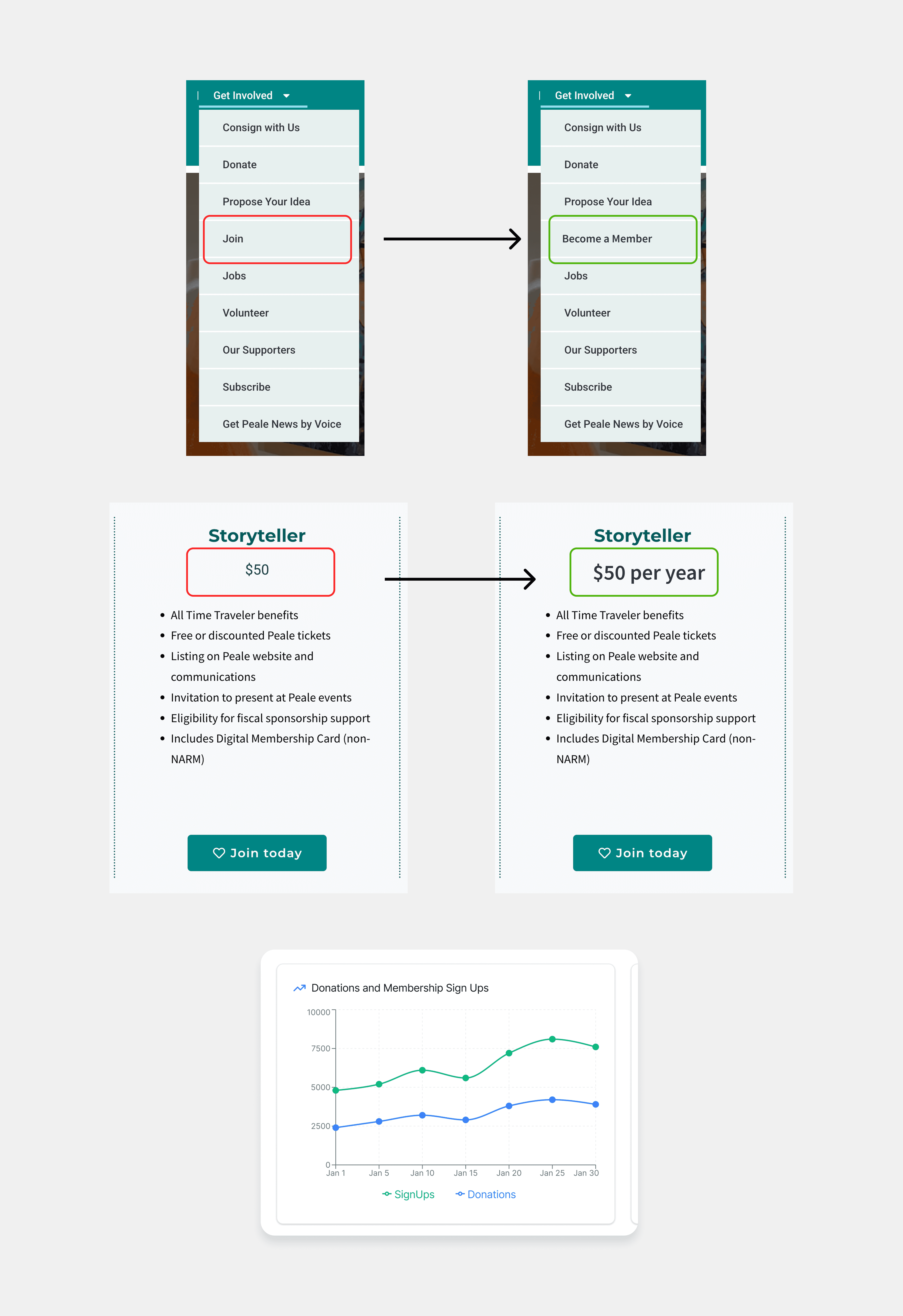Using a clear page on the website and explicitly labelling is “Become a Member” is a clearer call to action that reduces cognitive load on users, and doesn’t require them to click on the page to see what it contains. A clearer page title already reveals it’s contents