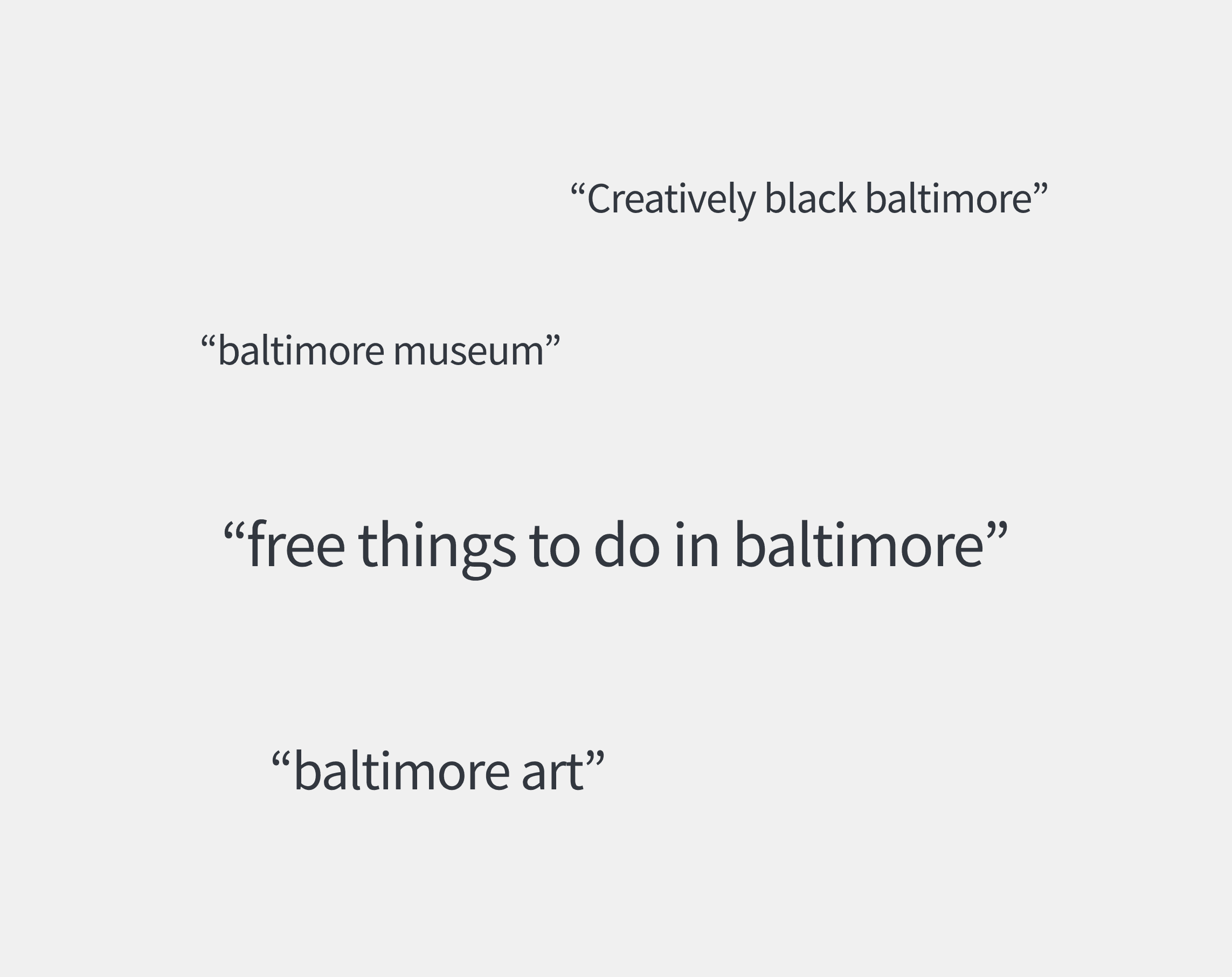 As for the keywords, create content targeting non-branded discovery keywords such as "baltimore museum," "baltimore art," "free things to do in baltimore"