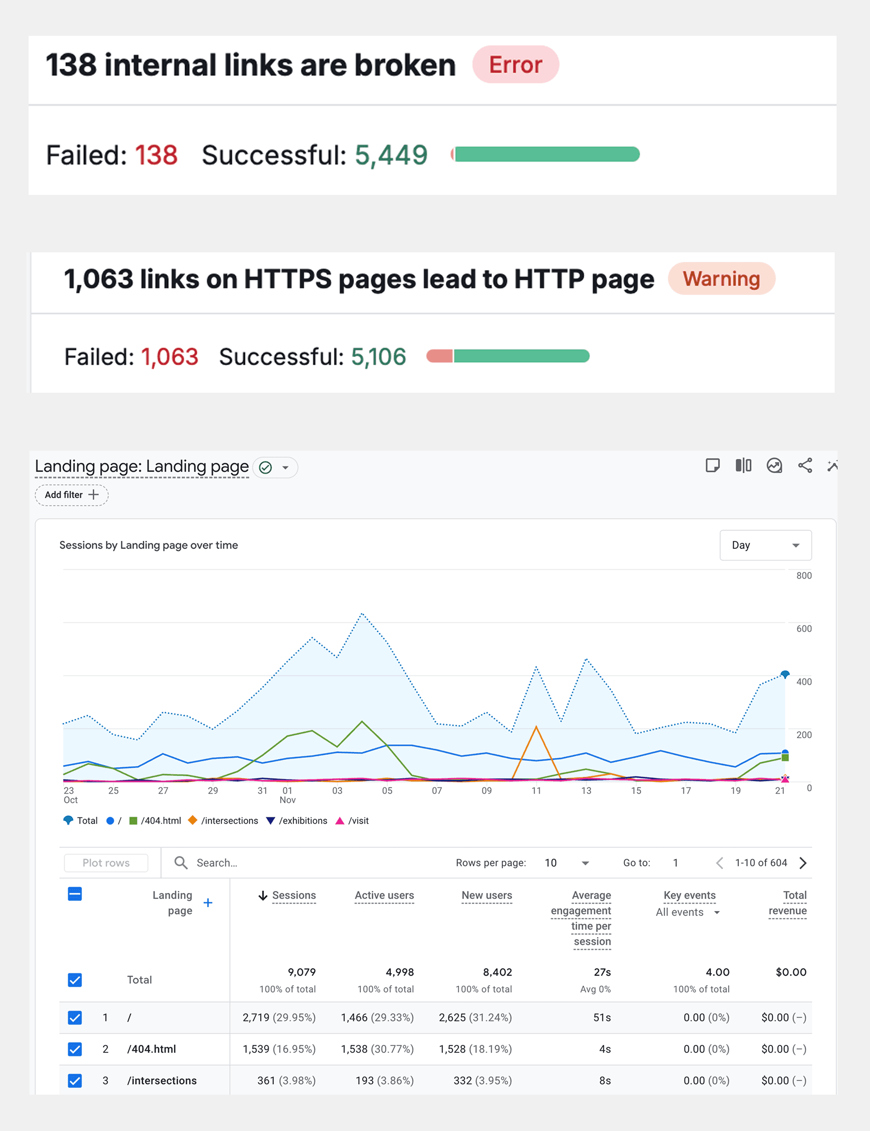 1,063 links on HTTPS pages point to old HTTP versions. Browsers show security warnings and search engines get confused about which version to rank. Visitors also distrust the site more with unsecured pages.