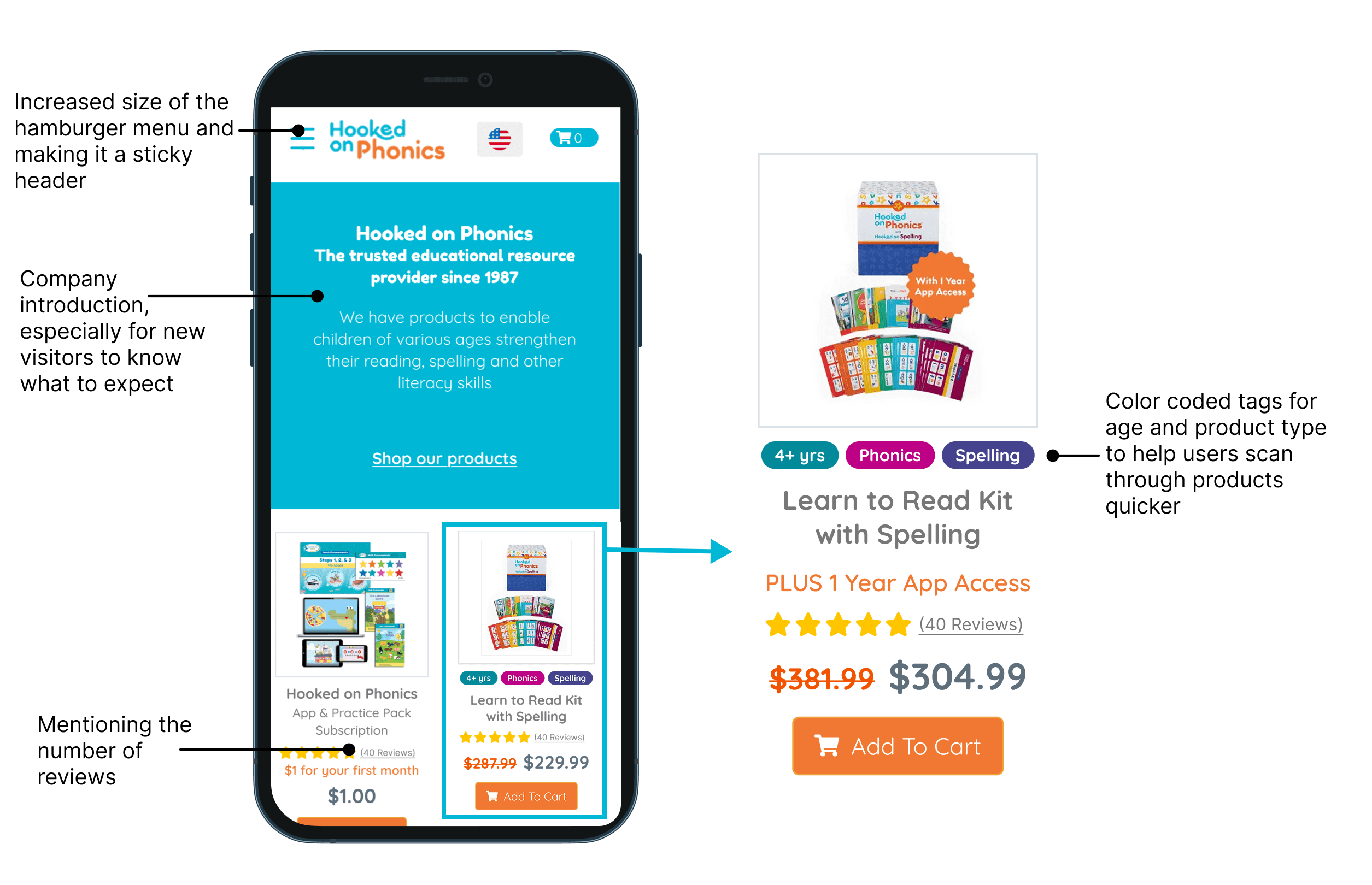 Hooked on Phonics wanted to revamp their shop page to enable better conversions and higher revenue. We set out to identify usability issues and friction points across the user journey on the shop page and aimed to address them. We aimed to