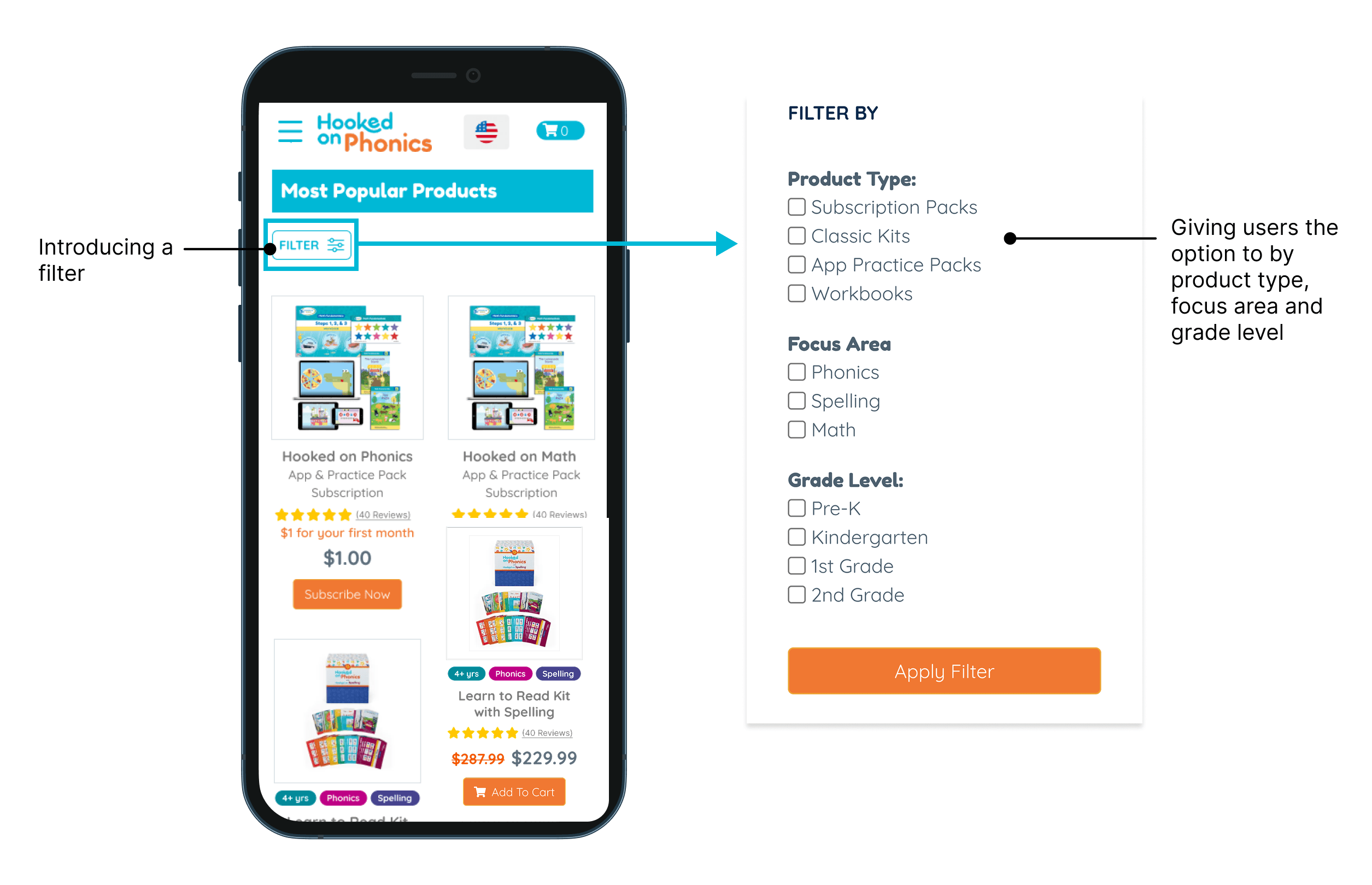 Here's the recommendation we propose: Adding a filter so that users can filter through products beyond just the grade level